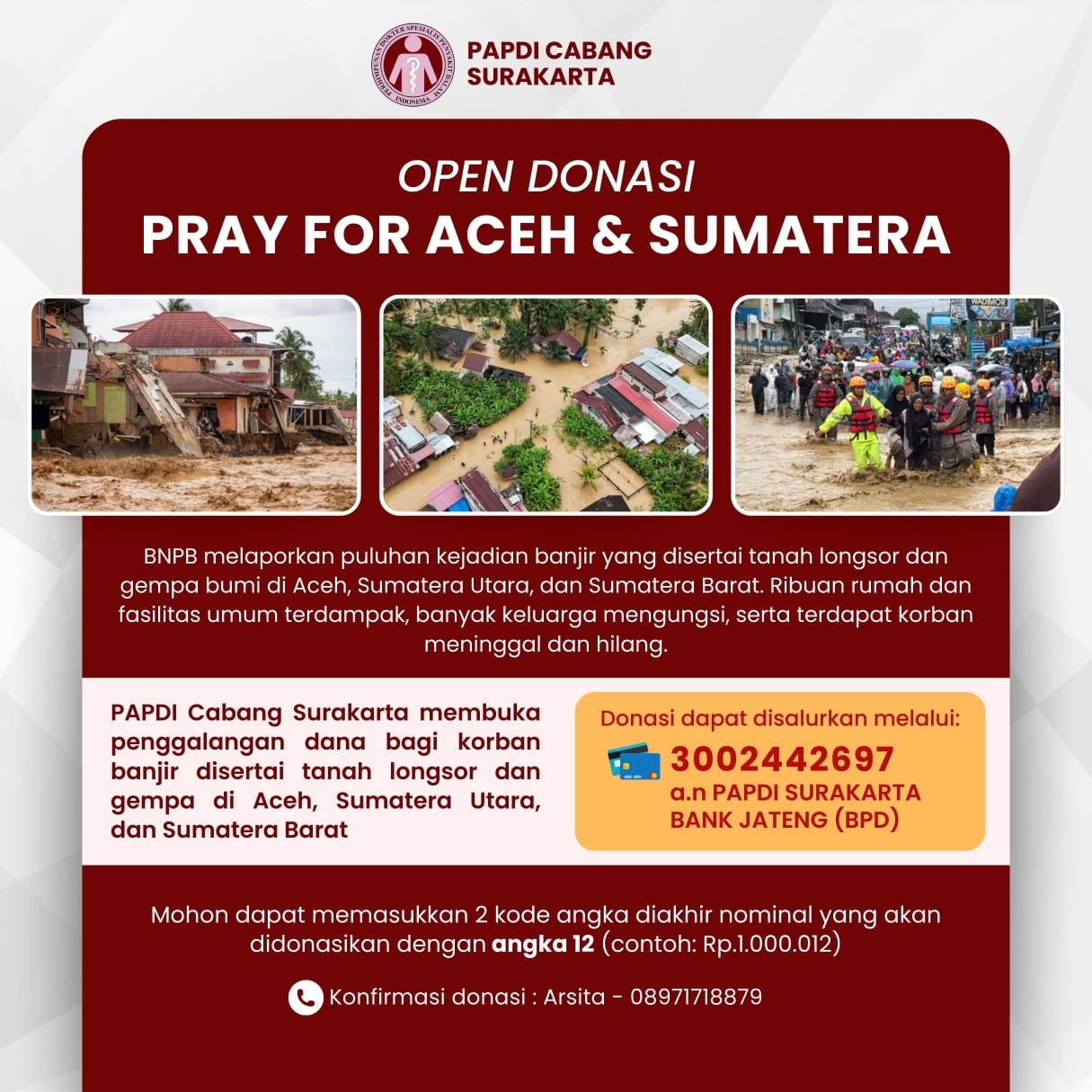 PAPDI Surakarta membuka penggalangan dana bagi korban banjir disertai tanah longsor dan gempa di Pulau Sumatera Bagi Prof/Dr/dr yang ingin berdonasi dapat melakukan transfer ke rekening berikut: No. Rekening : 3002442697 Nama Rekening : PAPDI Surakarta Bank JATENG (BPD) (Tambahkan keterangan "Donasi Bencana Alam" pada catatan saat transfer)
